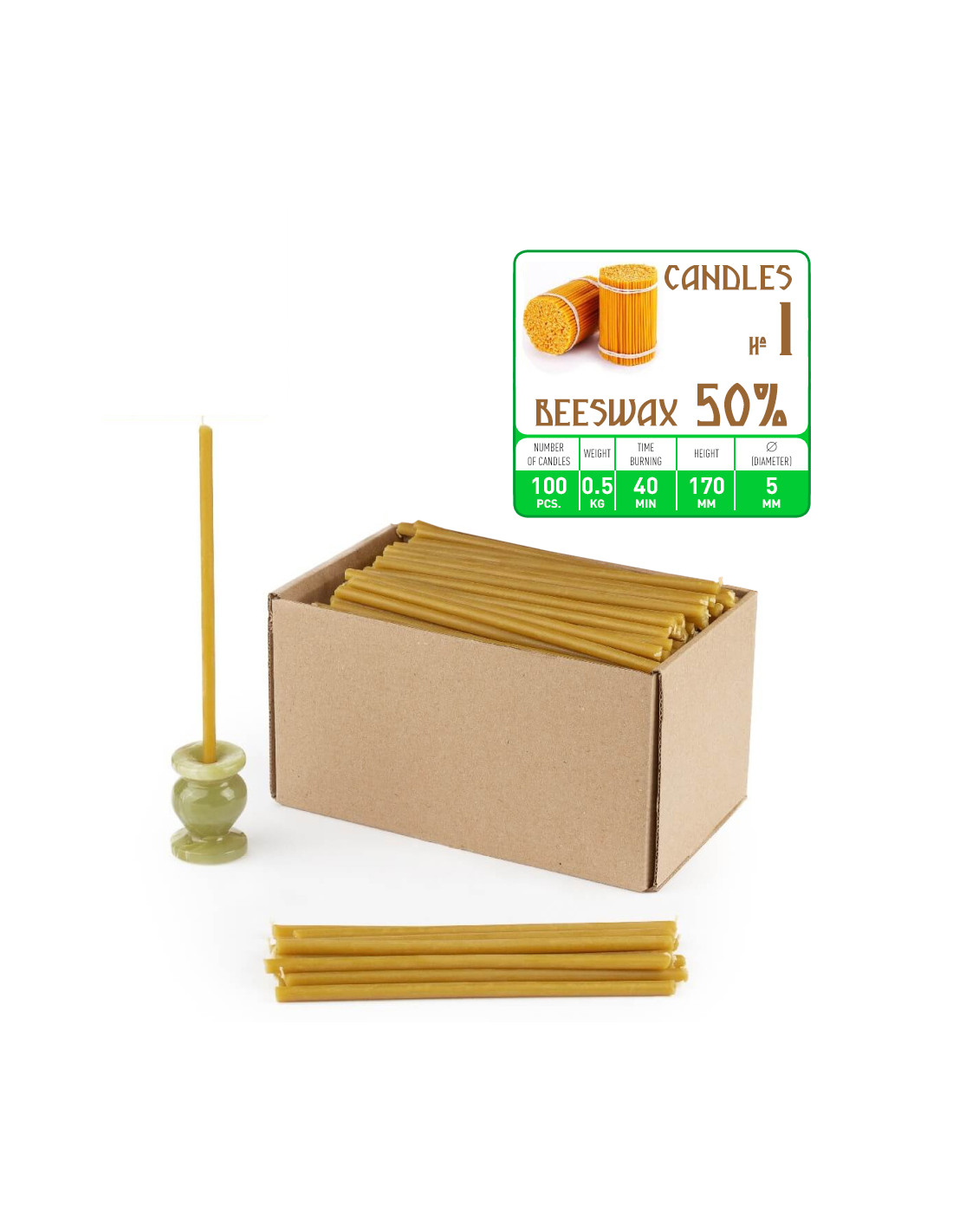 100 pièces (0,45 kilogrammes) de bougies d'église, 17 cm de hauteur, 0,5 cm d'épaisseur.