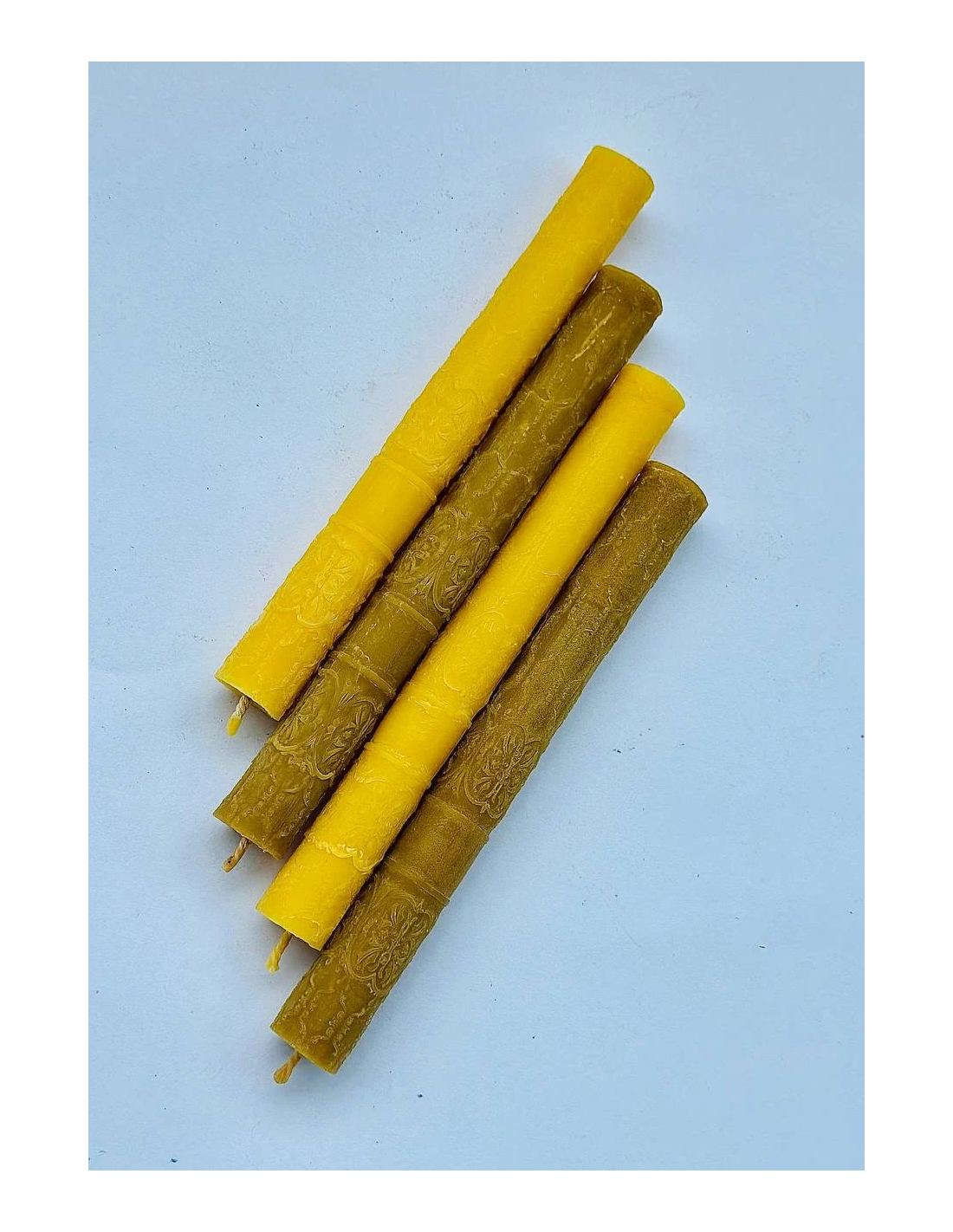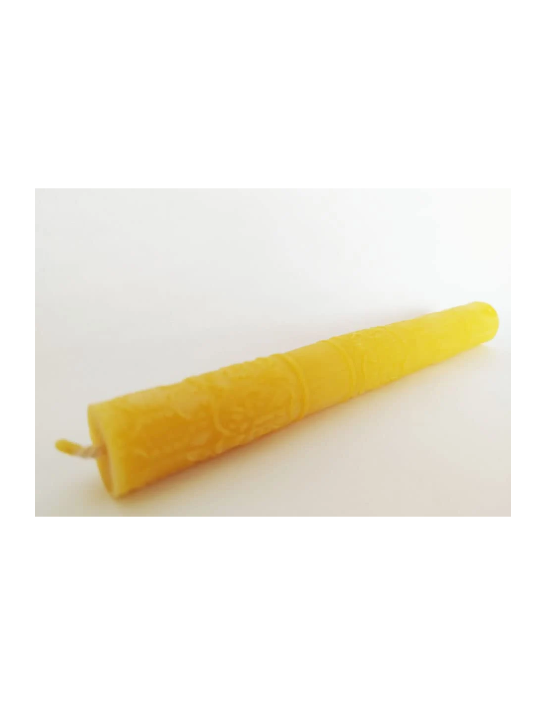 Dekorativna svijeća s reljefnim (utisnutim) uzorkom. Svijeće su ručno izrađene i ručno lijevane, bez kemikalija i bez mirisa, pa su 100% prirodne. U sredini svijeće nalazi se fitilj od 100% pamuka. Svijeća teži oko 50 g.